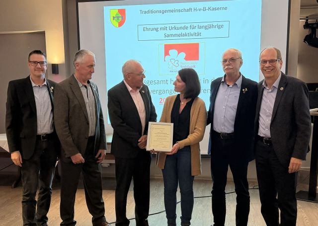 Ein Highlight dieser Veranstaltung war, dass diesmal unsere Traditionsgemeinschaft ausgezeichnet wurde. Für unsere seit 2011 regelmäßig durchgeführten Sammel- und Spendenaktivitäten verliehen uns die Regionalstellenleiterin des Bundeswehrsozialswerkes, Regierungsoberinspektorin Jessica Weihe, zusammen mit dem stellvertretenden Regionalstellenleiter, Oberstabsfeldwebel a.D. Holger Dreesen, eine Urkunde und eine Medaille.